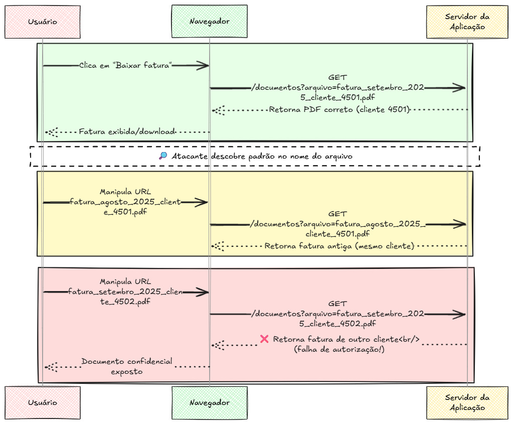 Se o sistema simplesmente entrega o arquivo com base no nome que foi solicitado, sem confirmar se o usuário logado tem permissão para vê-lo, a porta para o desastre está escancarada.
