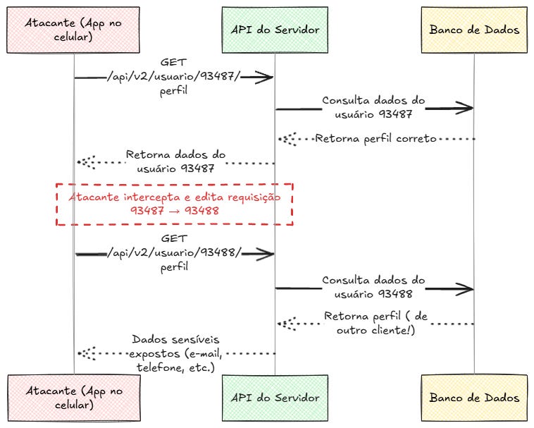 Esse é o app pedindo ao servidor: "Me traga os dados do perfil do usuário 93487". Novamente, a mesma lógica se aplica. O atacante pode pegar essa requisição e reenviá-la, mas trocando o ID 93487